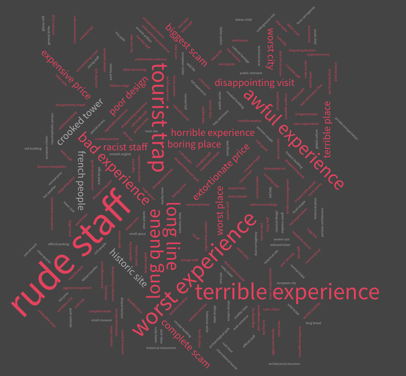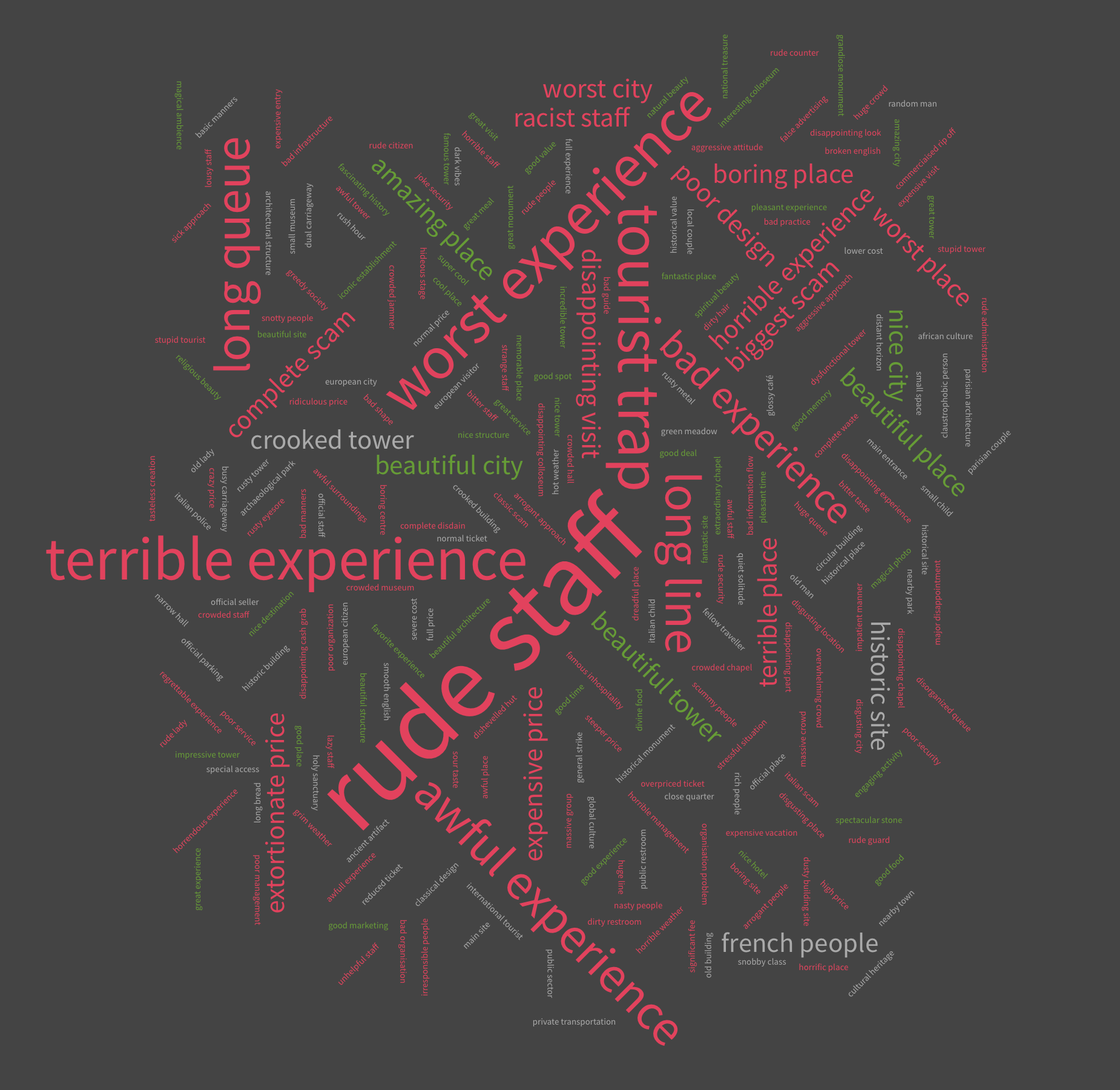 Analyzing all 500 of our reviews shows that some bad experiences are universal for all 5 places: rude staff, long lines, and tourist traps can turn any trip into a nightmare, or at least comedy gold material. Among the top 1o are also: expensive or extortionate prices, poor management, racist staff, crowdedness, grim weather, poor security, and of course, complete scam. The analysis also shows that even bad reviews contain some positive and neutral characteristics shown in green and white colors; Google Maps reviewers are not strangers to nuance.