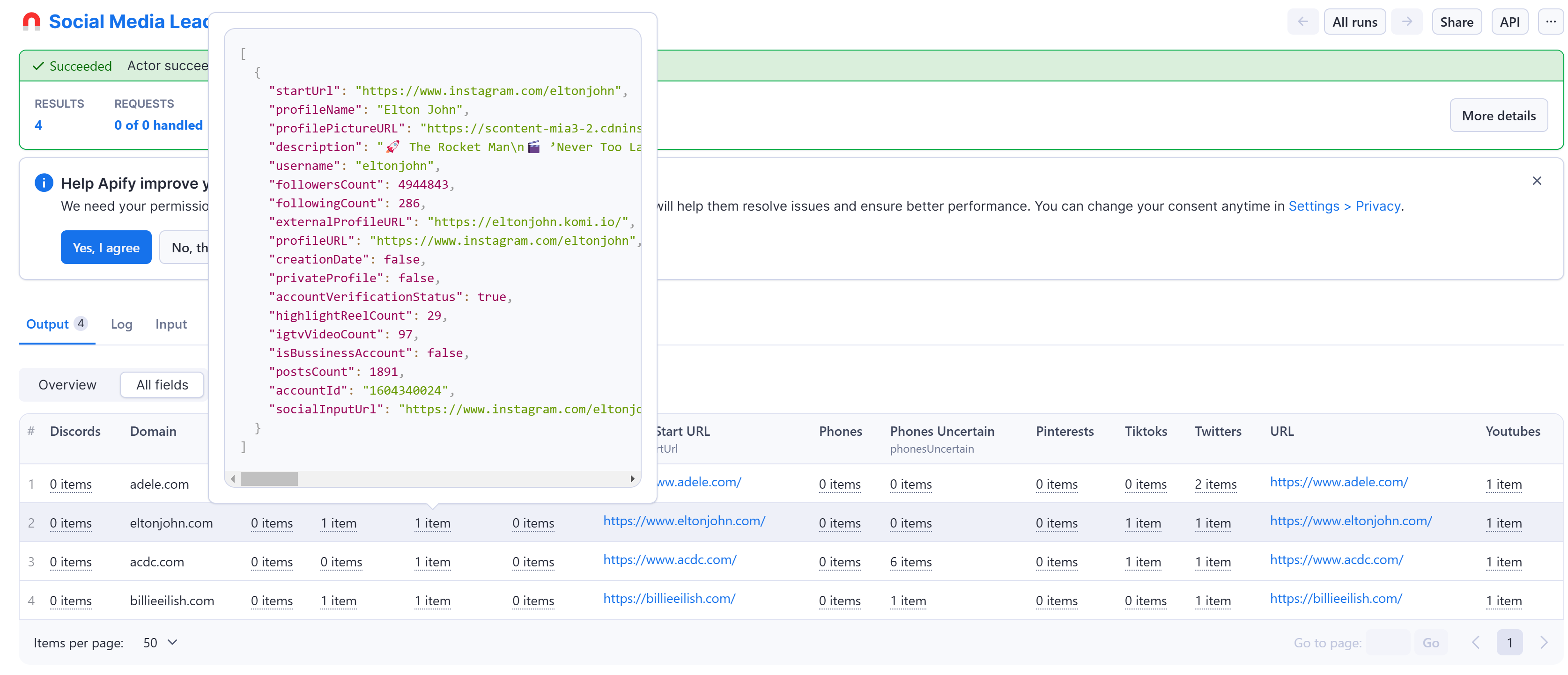 - Simply prepare the list of your leads’ URLs and put them into the Social Media Leads Analyzer input field. First, you’ll need to create an account on Apify. With our free plan, you can get up to 250 results.