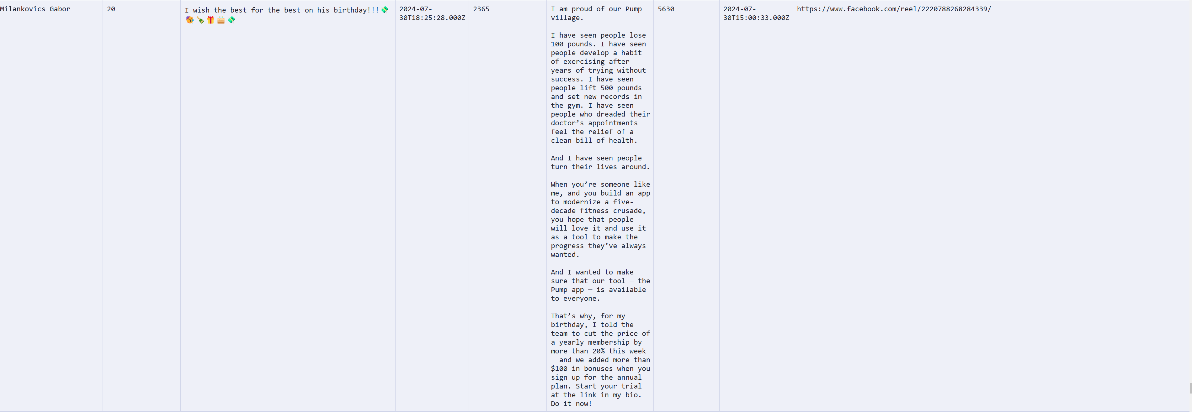 Let’s assume that I want to know how Arnold Schwarzenegger is doing on social media. I just put his name in the input field and hit the Start button. In less than a few minutes, I get this information about the newest comments on his profiles across social media.