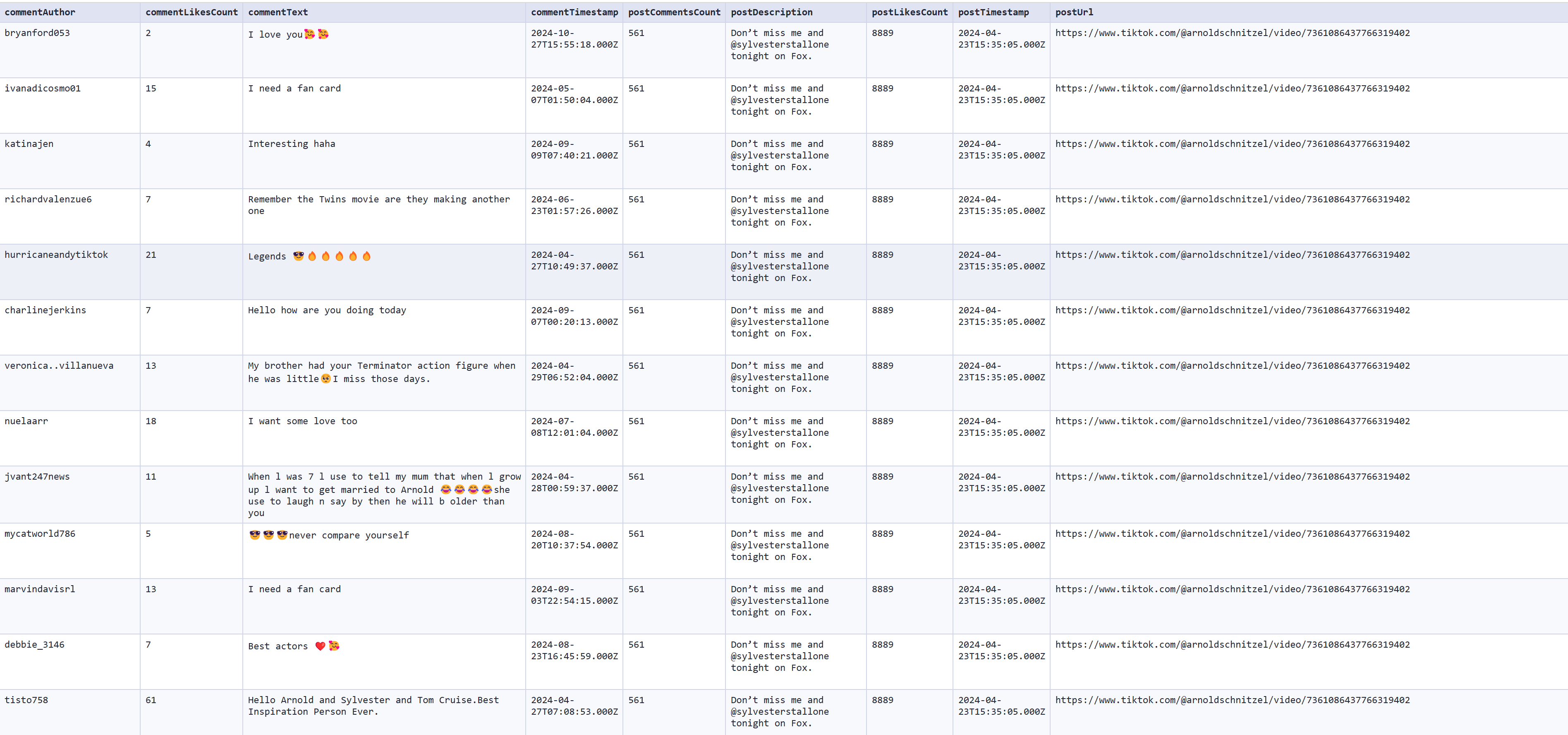You can get your data with just a hashtag, search query, or URL. The results will be displayed in a simple table. Just like this: