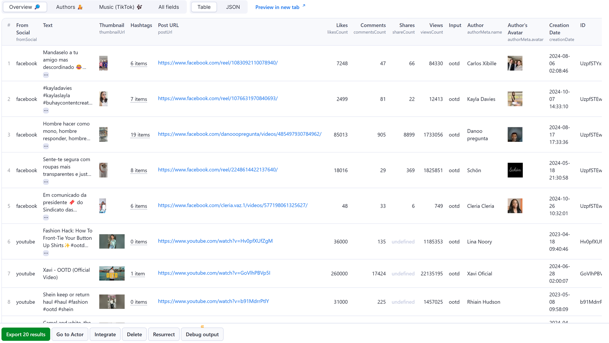 Let’s say you are about to do research on trending topics with the hashtag #OOTD. Simply fill in the input form with “OOTD” and run the scraper. Here are the results: