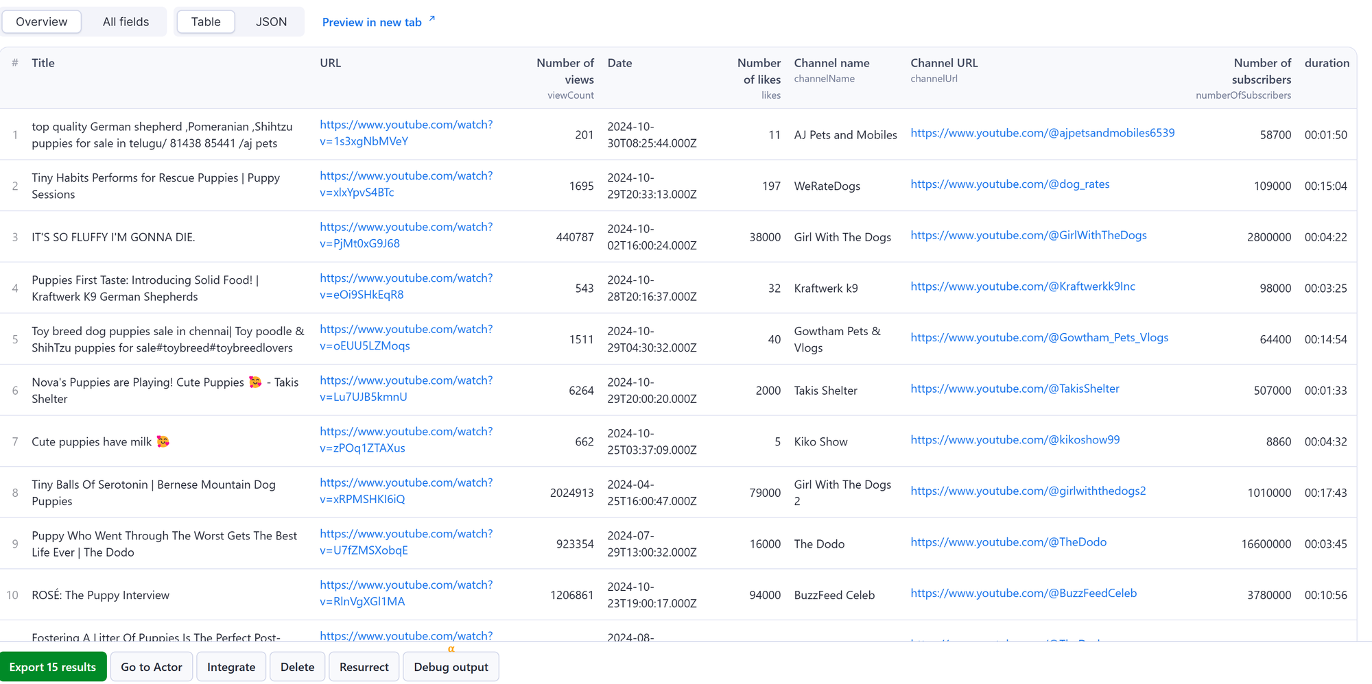 See what data you get with YouTube Scraper just by entering the query puppies.