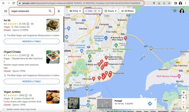 Open a new tab with Google Maps. Search for Lisbon, Portugal -> Vegan restaurant and then filter your results by best reviewed 4.5+ 🌟. These are the vegan places of our interest, the best of the best. We will be collecting data on each of these vegan spots by simply using the URL provided at the top. After the search part is complete, all we have to do here is just copy that URL.
