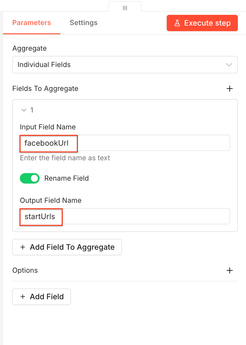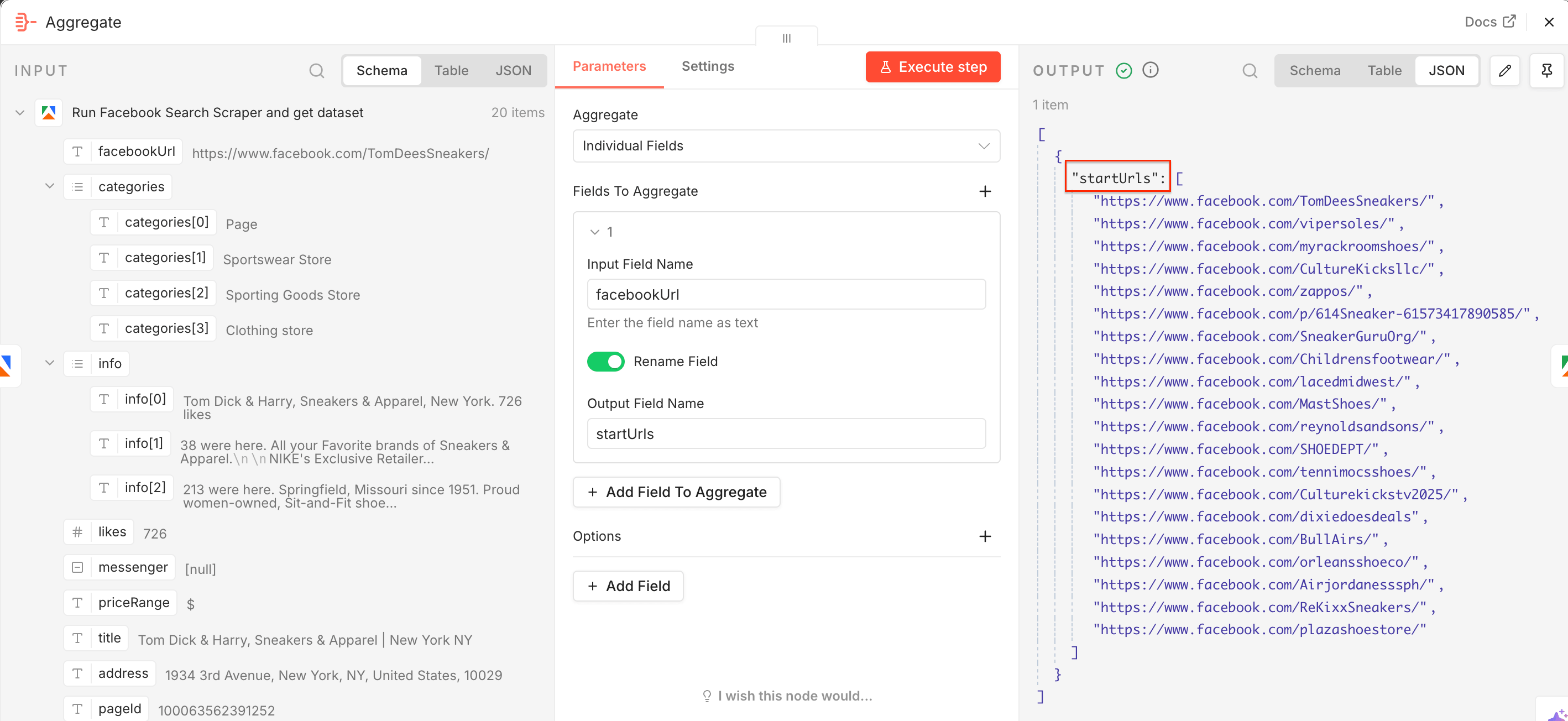 Now we need to add the extracted Facebook URLs to the startUrls input field, used by the second scraper. In the node, drag and drop the facebookUrl field to the Input Field Name, switch on the Rename Field toggle, and type in the Output Field Name - startUrls. Once you execute the step, you’ll notice the JSON output is already correctly renamed.