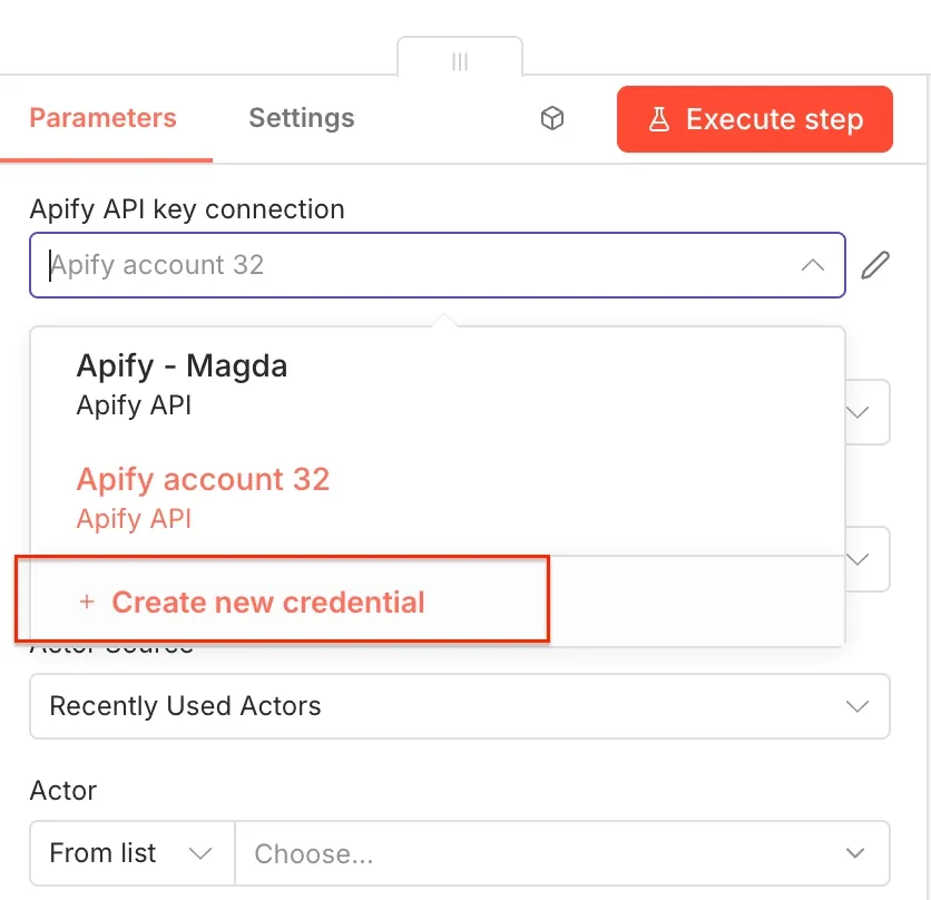 Select the Run an Actor and get dataset operation as the second workflow step. Once you open the node, you can connect n8n to your Apify account. Click on Create new credential to get started.