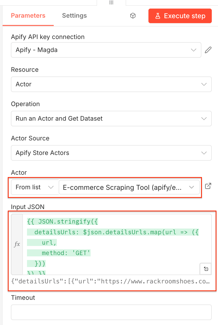 Add a third Apify node - Run actor and get dataset - and configure it as before. Select E-commerce Scraping Tool from the Actor list.