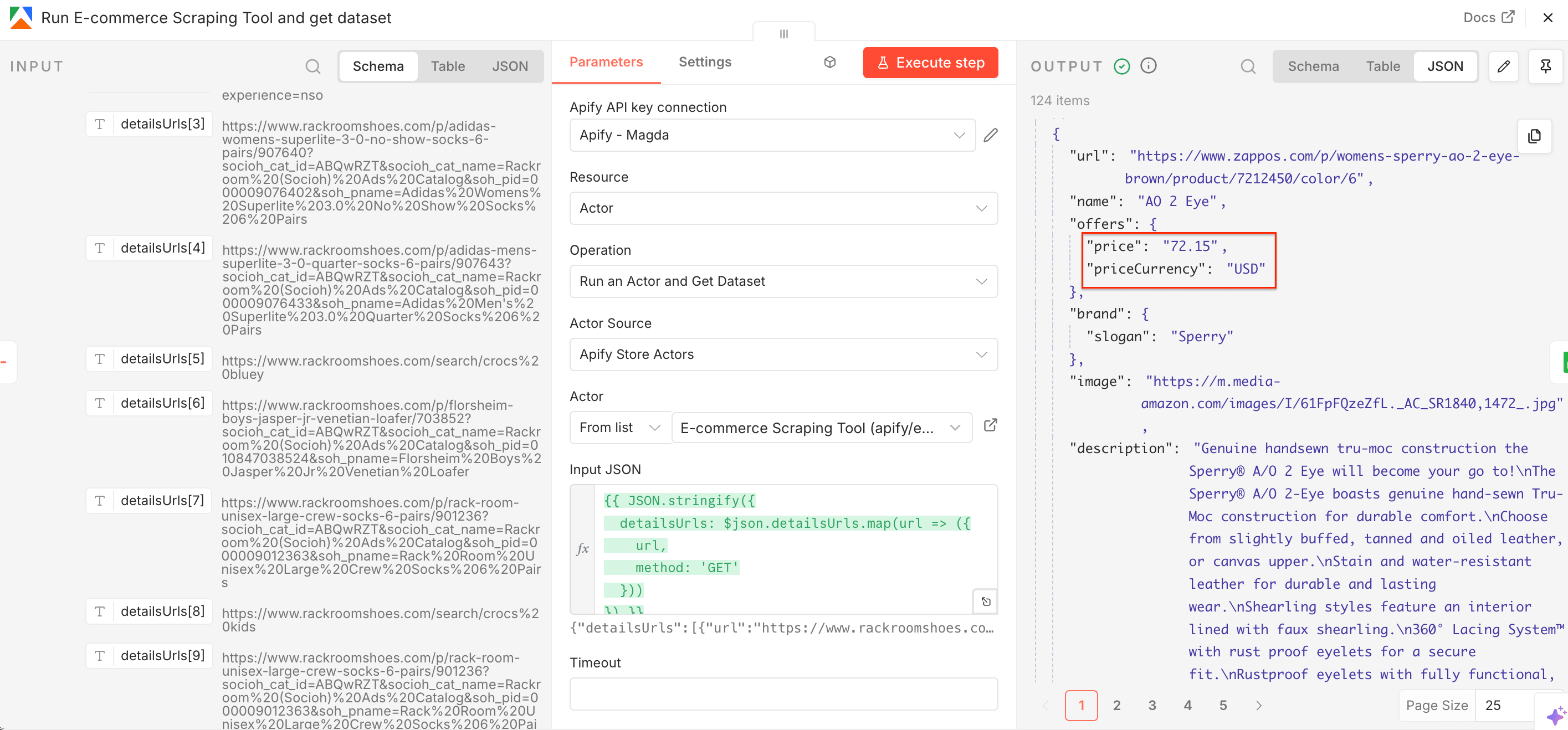Once this Actor runs, it returns structured product data together with a price and currency.