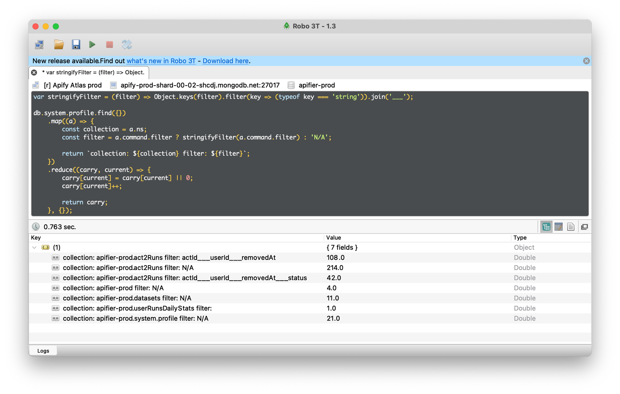 Now, with recent commands stored in the db.system.profile collection, you can easily analyze them with MongoDB queries and additional JavaScript code. For example, here I aggregate the number of queries per collection and filter: