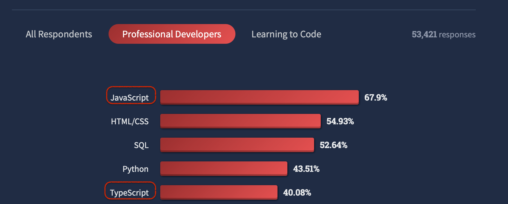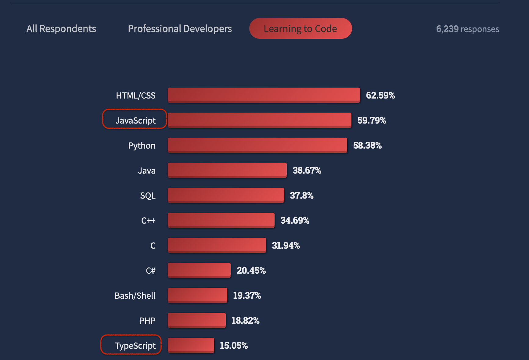 Also, you can take a look at how developers themselves decide on this. Both beginner and pro categories share an over 59% liking towards JavaScript in general. However, beginner developers seem to be cautious about TypeScript (15%), while professional developers lean in heavily (40%).