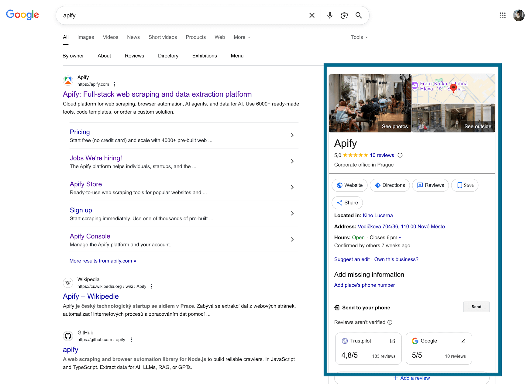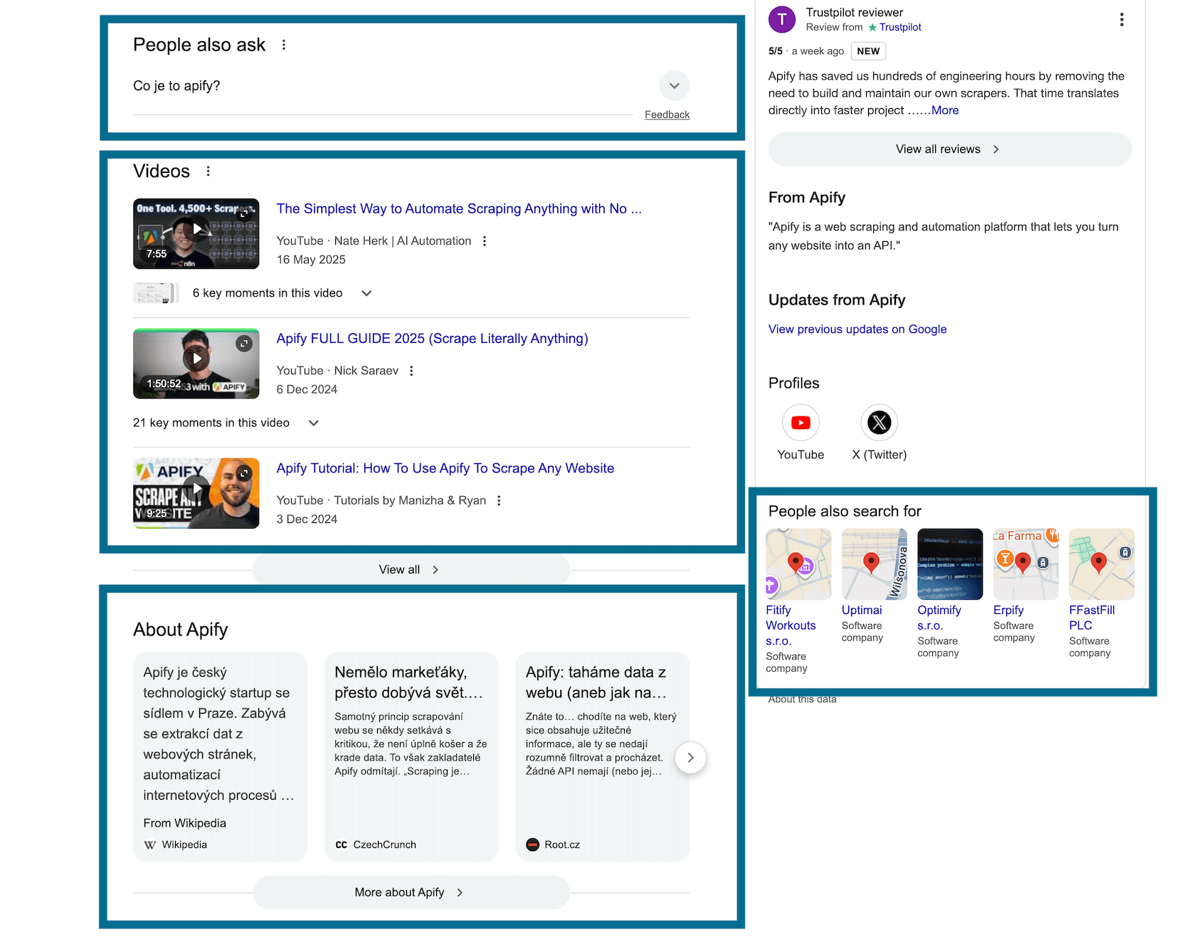Apify’s scraper for Google SERP is a straightforward tool that you can run immediately, without code: It will get your search request, conduct the search on google.com, and extract raw data from the result pages. It covers key SERP elements such as organic + paid results, People Also Ask boxes, related queries, prices, and reviews.