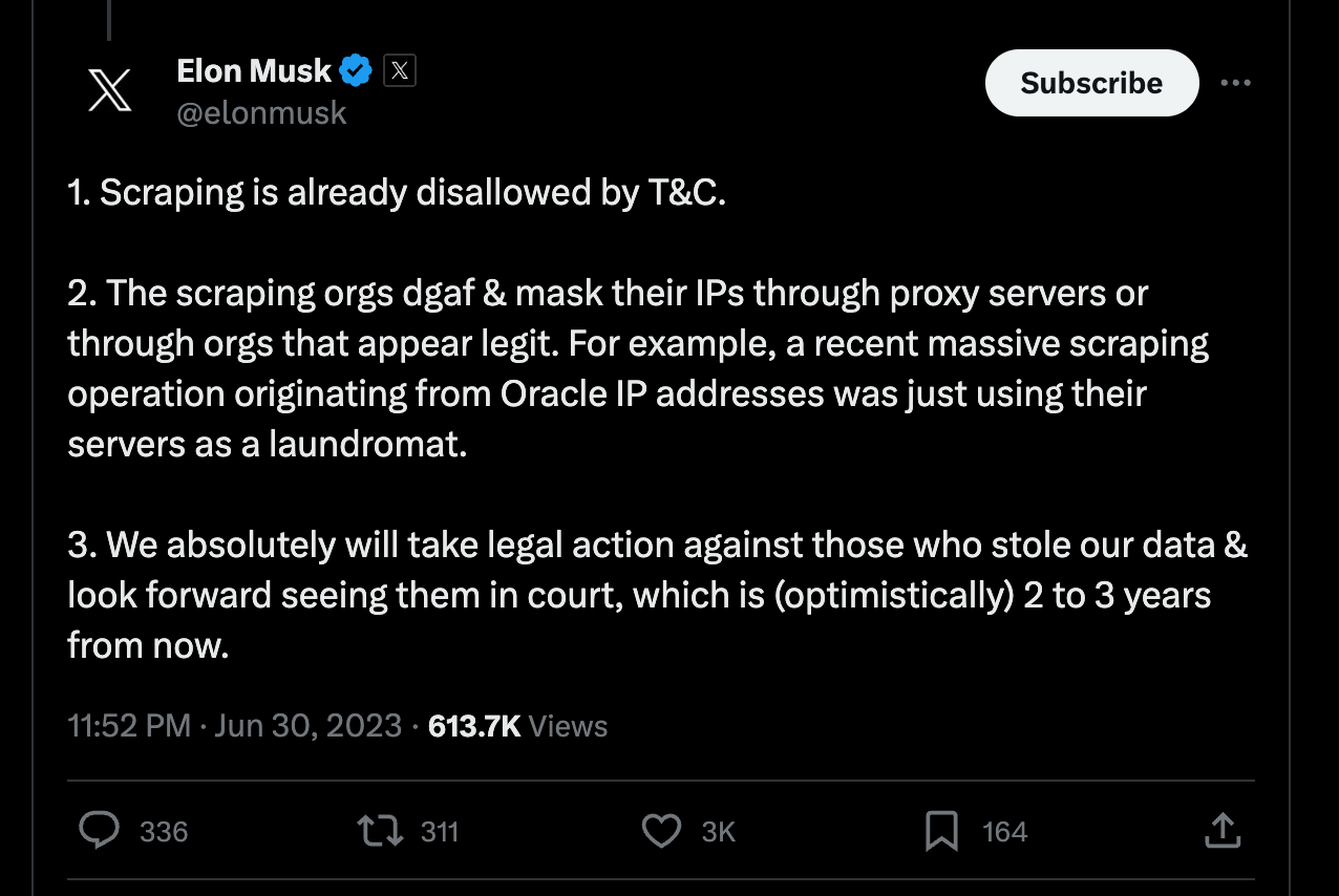 And as a regular cherry on top, the lawsuit further accuses them of scraping Twitter user data in breach of the platform's user agreement. These days, breach of Terms of Service has become companies’ favorite reference when instigating lawsuits against web scraping. Seconded only by scraping data for large language models training — which is a concern raised by Elon Musk as well. Despite these latter allegations, he did confirm that his recently launched firm, xAI, will use X posts for training purposes. So go figure.
