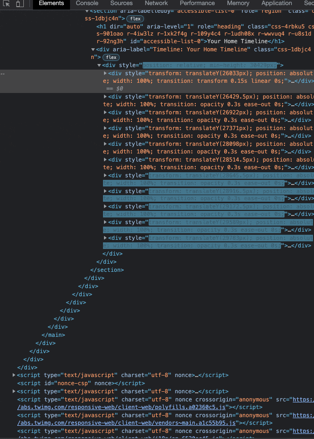 Going a step further, we can take a look at the DOM (the HTML of the site) to watch these elements being rendered live as we scroll and confirm our hunch that a page is, in fact, dynamic: