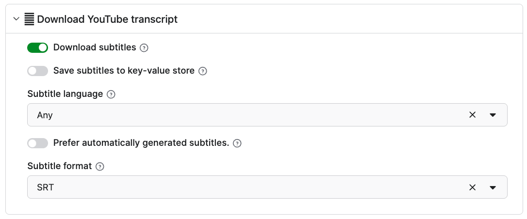 You can customize your search further with the filtering options, such as time range, sorting order, video type or features. The scraper can also fetch video subtitles and convert them to a format of your choosing - particularly useful for AI workflows, since LLMs process text much more efficiently than video.