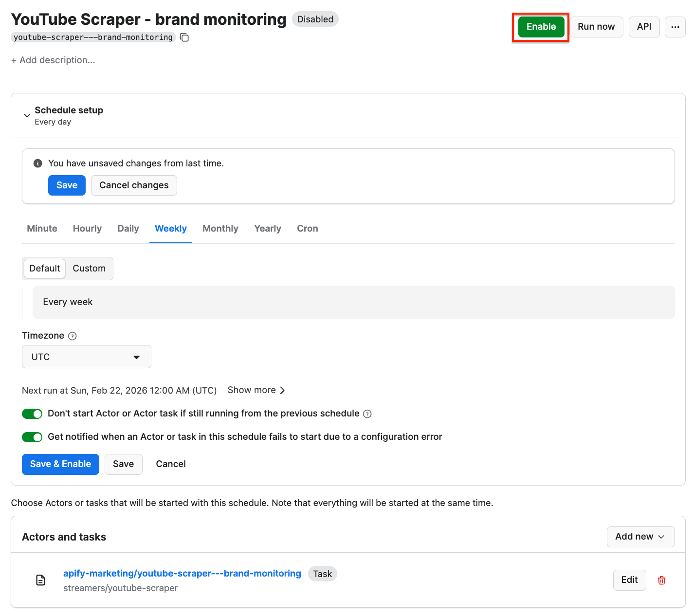 Click Enable, and your schedule will be up and running. It will automatically start the scraper at your chosen time and send the results to Google Drive, thanks to the integration we set up earlier.